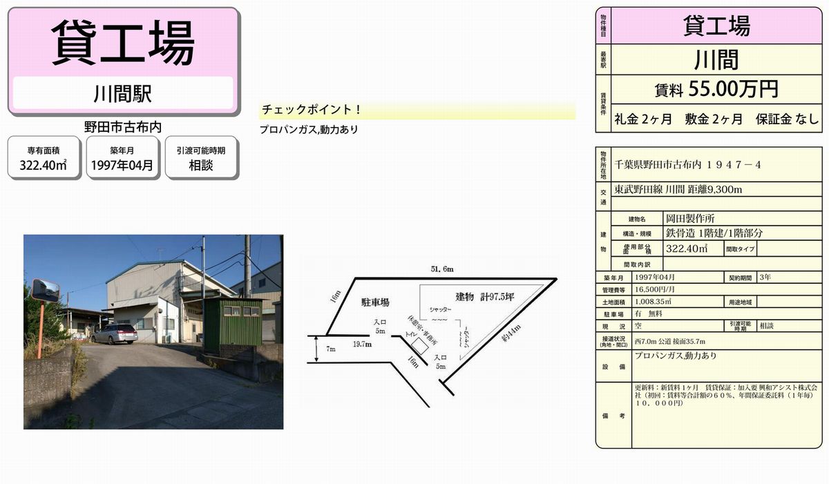 千葉県野田市古布内1947-4 (川間) 岡田製作所 詳細データ