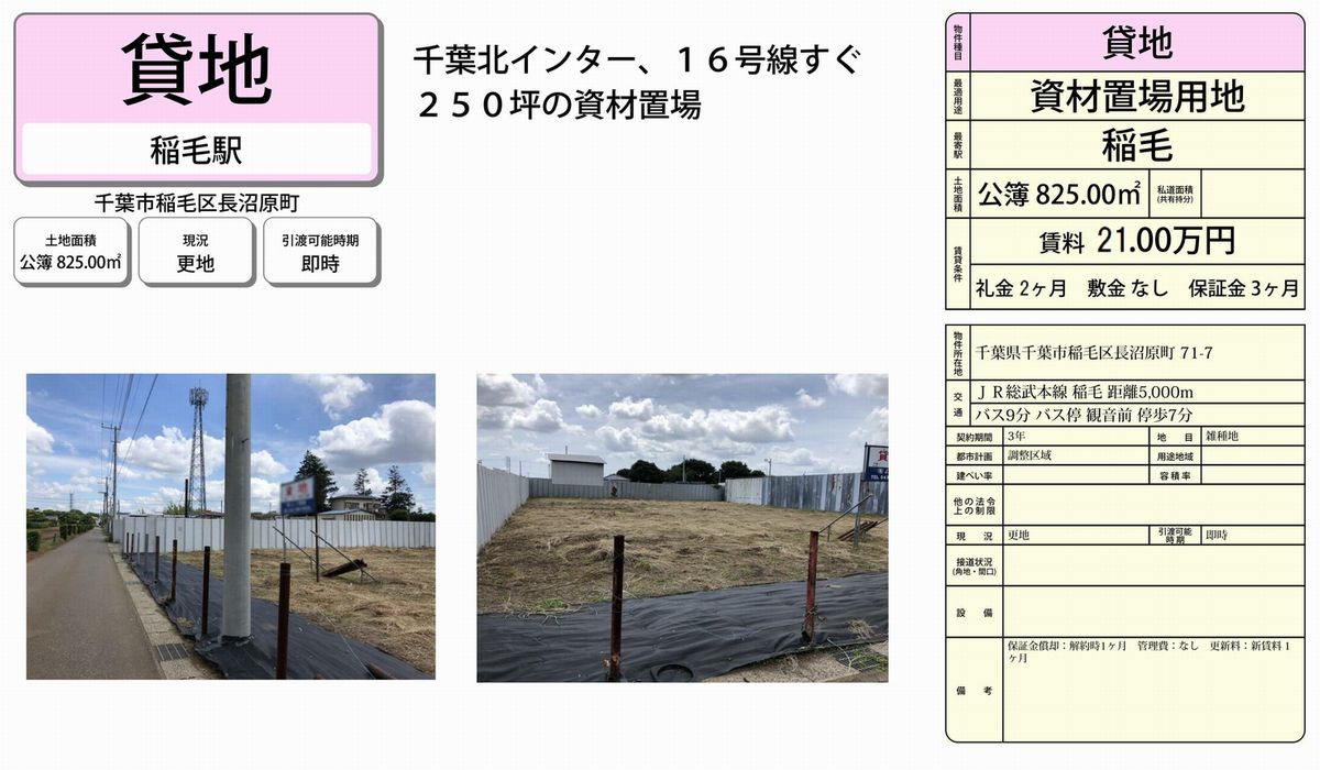 千葉県内の貸し倉庫・貸し工場の情報満載(トップ) > 千葉のエリアで探す > 千葉市稲毛区 > 稲毛 > 千葉市稲毛区長沼原町71-7 長沼原町貸地