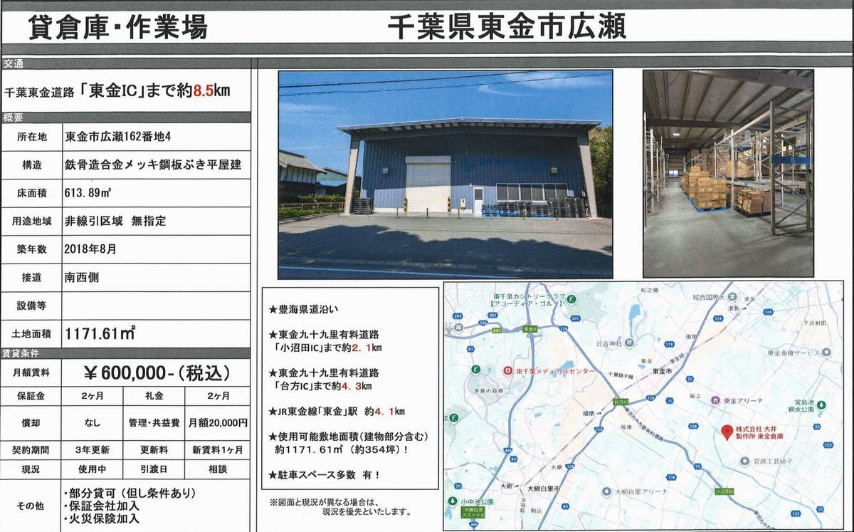 千葉県東金市広瀬162-4(千葉県)の貸し倉庫・貸し工場をはじめ千葉全域の貸し倉庫・貸し工場を検索できます。東金市広瀬162-4(千葉県)の事務所付貸倉庫、クレーン付工場、店舗倉庫、工業専用地域等、ニーズに合わせて簡単検索。東金市広瀬162-4(千葉県)の貸し倉庫・貸し工場を貸したい方にはオーナーサポートシステムで無料にて査定・掲載いたします。東金市広瀬162-4(千葉県)で貸し倉庫・貸し工場をご契約のテナント様には貸し倉庫・貸し工場の設計変更、造作のご相談・施工も承ります。貸し倉庫・貸し工場で移転・新規開設をするなら千葉地区最大級のテナント.com! |