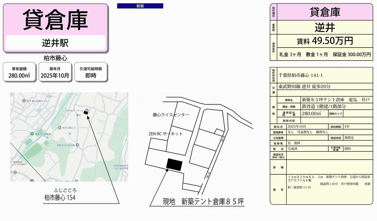 千葉県柏市藤心141-1 (逆井) 逆井 貸倉庫 詳細データ