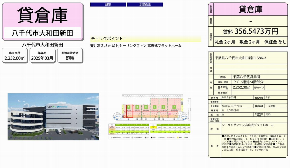| 備考 | 高床式 EV ドックレベラー 倉庫内シーリングファン 男女別トイレ 24時間換気システム リフト |