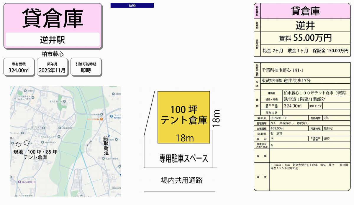千葉県柏市藤心141-1 (逆井) 逆井 貸倉庫 詳細データ