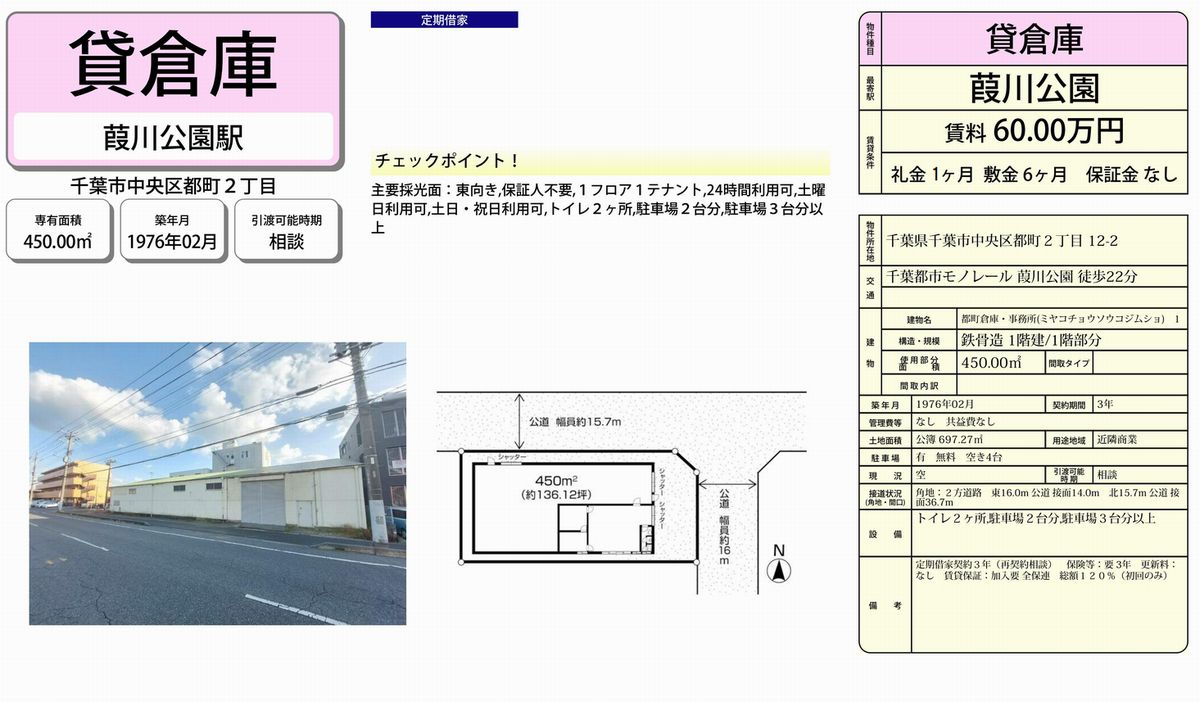 千葉県千葉市中央区都町2-12-2(千葉県)の貸し倉庫・貸し工場をはじめ千葉全域の貸し倉庫・貸し工場を検索できます。千葉市中央区都町2-12-2(千葉県)の事務所付貸倉庫、クレーン付工場、店舗倉庫、工業専用地域等、ニーズに合わせて簡単検索。千葉市中央区都町2-12-2(千葉県)の貸し倉庫・貸し工場を貸したい方にはオーナーサポートシステムで無料にて査定・掲載いたします。千葉市中央区都町2-12-2(千葉県)で貸し倉庫・貸し工場をご契約のテナント様には貸し倉庫・貸し工場の設計変更、造作のご相談・施工も承ります。貸し倉庫・貸し工場で移転・新規開設をするなら千葉地区最大級のテナント.com! |