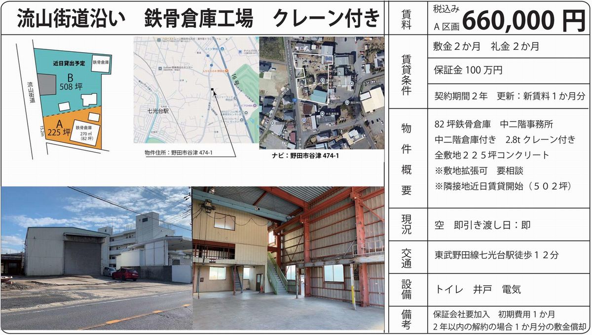 | 備考 | 2.8tクレーン付 トイレ 中2階有 |