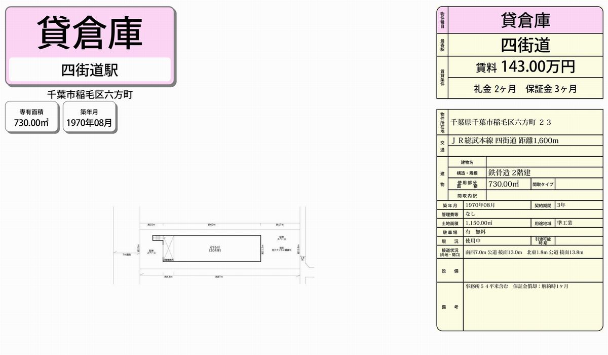 千葉県千葉市稲毛区六方町23 (四街道) 四街道 貸倉庫 詳細データ