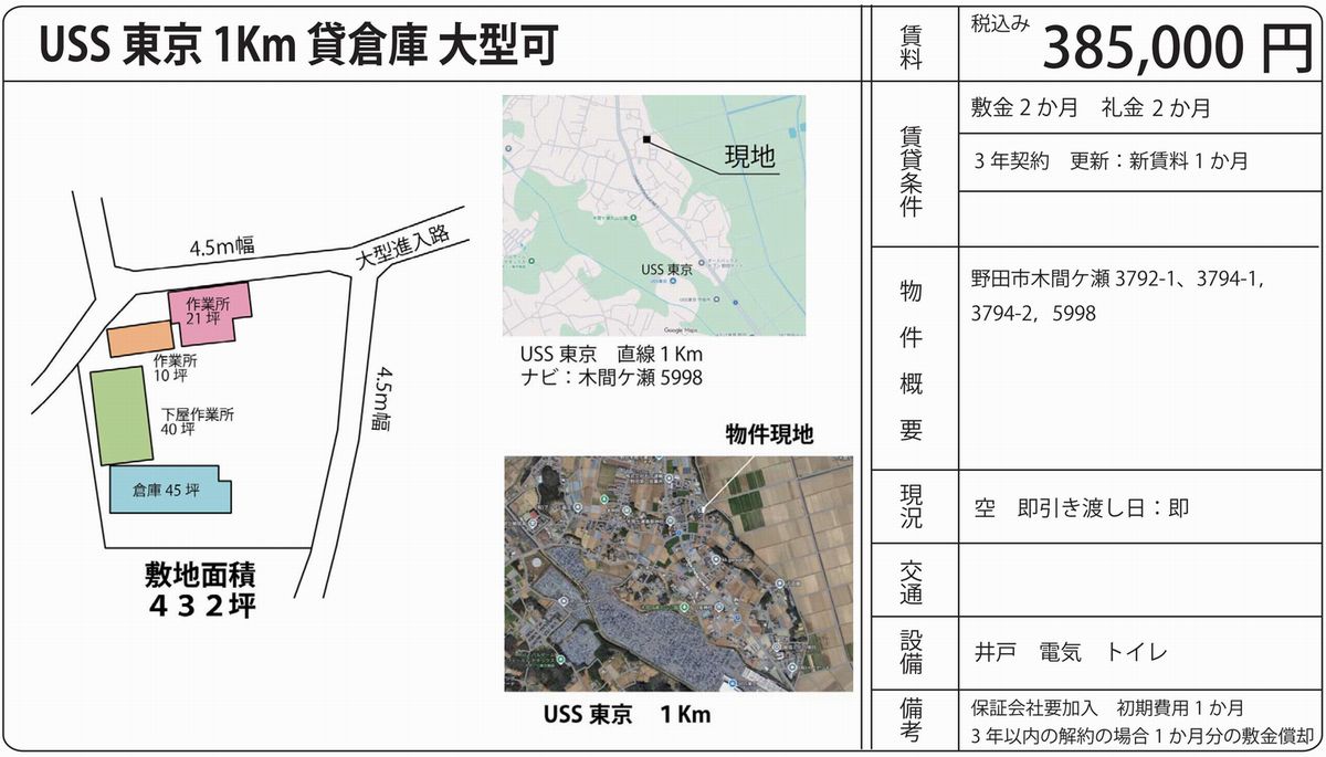 千葉県野田市木間ケ瀬3792-1(千葉県)の貸し倉庫・貸し工場をはじめ千葉全域の貸し倉庫・貸し工場を検索できます。野田市木間ケ瀬3792-1(千葉県)の事務所付貸倉庫、クレーン付工場、店舗倉庫、工業専用地域等、ニーズに合わせて簡単検索。野田市木間ケ瀬3792-1(千葉県)の貸し倉庫・貸し工場を貸したい方にはオーナーサポートシステムで無料にて査定・掲載いたします。野田市木間ケ瀬3792-1(千葉県)で貸し倉庫・貸し工場をご契約のテナント様には貸し倉庫・貸し工場の設計変更、造作のご相談・施工も承ります。貸し倉庫・貸し工場で移転・新規開設をするなら千葉地区最大級のテナント.com! |