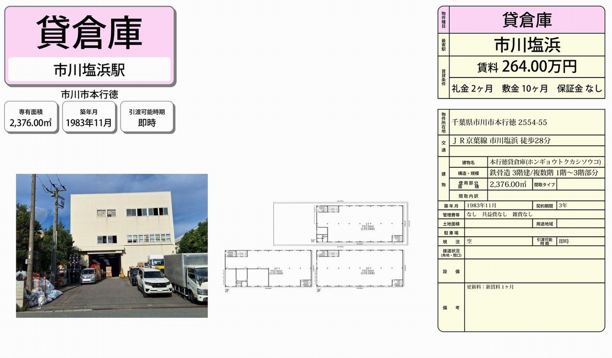 千葉県市川市本行徳2554-55 (市川塩浜) 市川塩浜 貸倉庫 詳細データ