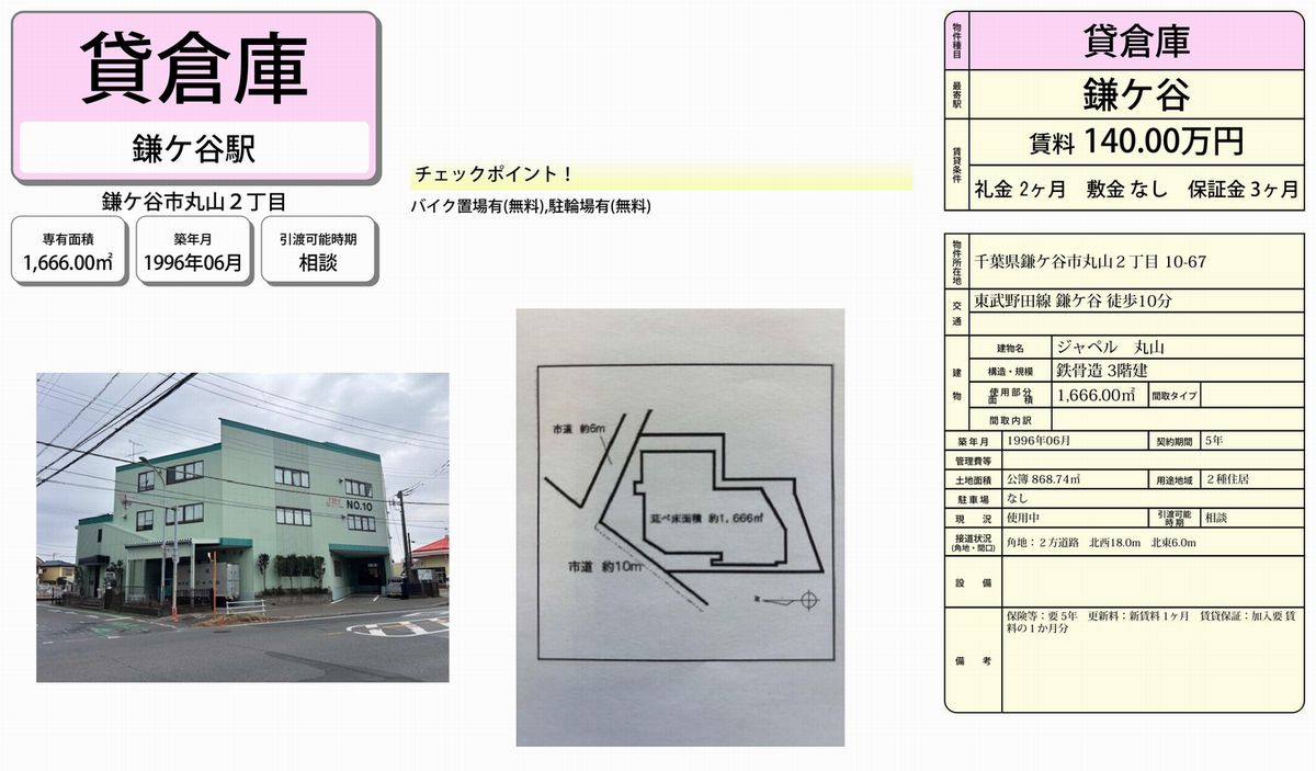 千葉県鎌ケ谷市丸山2-10-67(千葉県)の貸し倉庫・貸し工場をはじめ千葉全域の貸し倉庫・貸し工場を検索できます。鎌ケ谷市丸山2-10-67(千葉県)の事務所付貸倉庫、クレーン付工場、店舗倉庫、工業専用地域等、ニーズに合わせて簡単検索。鎌ケ谷市丸山2-10-67(千葉県)の貸し倉庫・貸し工場を貸したい方にはオーナーサポートシステムで無料にて査定・掲載いたします。鎌ケ谷市丸山2-10-67(千葉県)で貸し倉庫・貸し工場をご契約のテナント様には貸し倉庫・貸し工場の設計変更、造作のご相談・施工も承ります。貸し倉庫・貸し工場で移転・新規開設をするなら千葉地区最大級のテナント.com! |